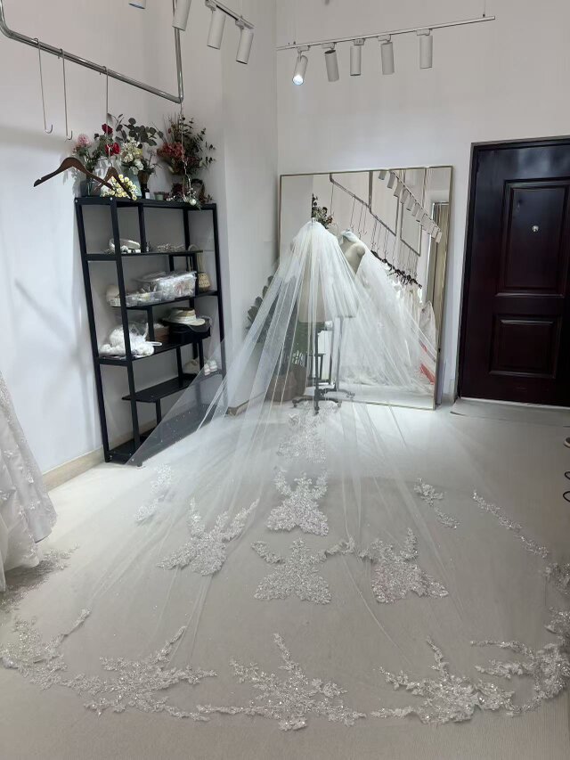 華やか ロングベール キラキラ光る刺繍 咲き誇る透け花レース フランス風 結婚式 花嫁
