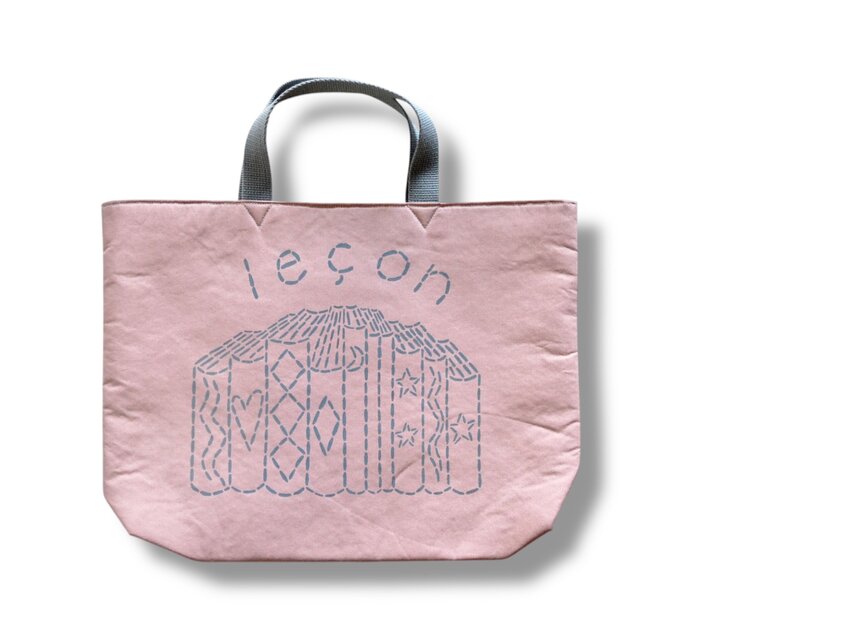 小さなお子様が直感的に楽しくおでかけの準備ができるように星やハートが背表紙になった本とフランス語で授業やおけいこを意味する「leçon」の文字をバッグ本体やハンドル部分のカラーと響きあうようにステッチ風にハンドペイントしました。