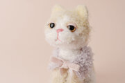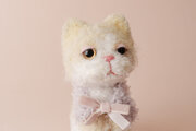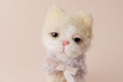 ツヤのあるファーヤーンで編み上げたパステルイエローの短い毛並みに、まつ毛で縁取られ金色の瞳がチャームポイントのリリちゃん。