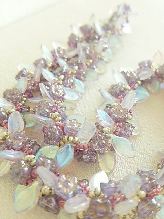 ライトラベンダーのチェコビーズはフラワー型のものを用い、