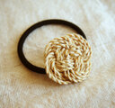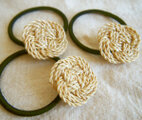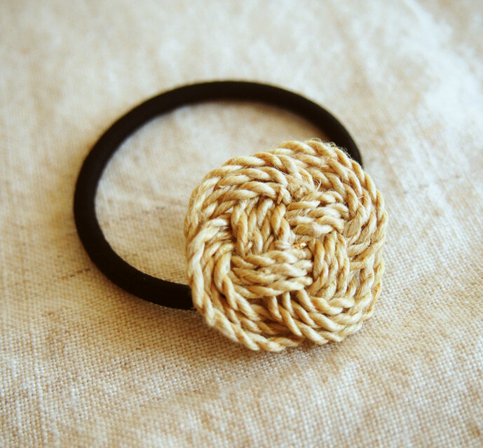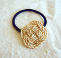 国産の精麻(麻の茎の繊維)のひもであわじ結びを3重にして、ヘアゴムにつけました。