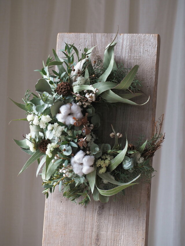 ユーカリ(8種)、ブルーアイス、ナンキンハゼの実、月桃の実、モミジバフウの実、サオトメバナの実、コットン、メタセコイアの実、スターチス(2種)
