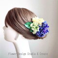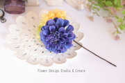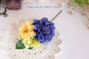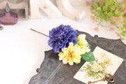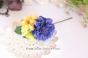 青と黄色のダリアと紫陽花の髪飾り フラメンコ イエロー 青い花 黄緑 ブルー 髪飾り 花 フローレス ダンス フラメンコの髪飾り