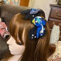 パキッとした紺色の生地と、重厚感のある黒レースを大胆に組み合わせた、スタイリッシュなカチューシャです。鮮やかなブルーの柄ゆきに、漆黒のレースと純白のパールビーズが映えるドラマチックな仕上がり。甘くなりがちなリボンモチーフを、色使いでクールに引き締めました。どこかミステリアスで格好良い、自立した女性の美しさを引き立てる逸品です。