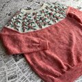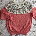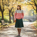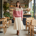 冬の装いに華やぎを添える、コーラルピンクの丸ヨークセーターです。