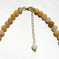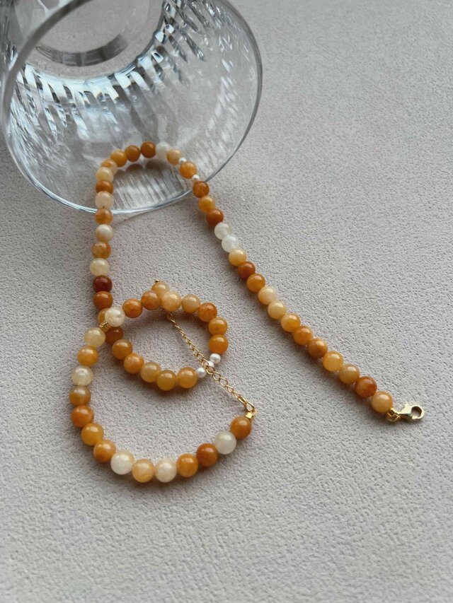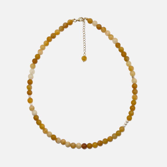 やわらかなイエローカラーが印象的な高品質イエローアベンチュリン(6mm) をベースに、淡水パールとゴールドのきらめきをさりげなく添えた、軽やかで穏やかな印象の クリスタルビーズネックレス です。