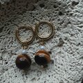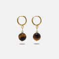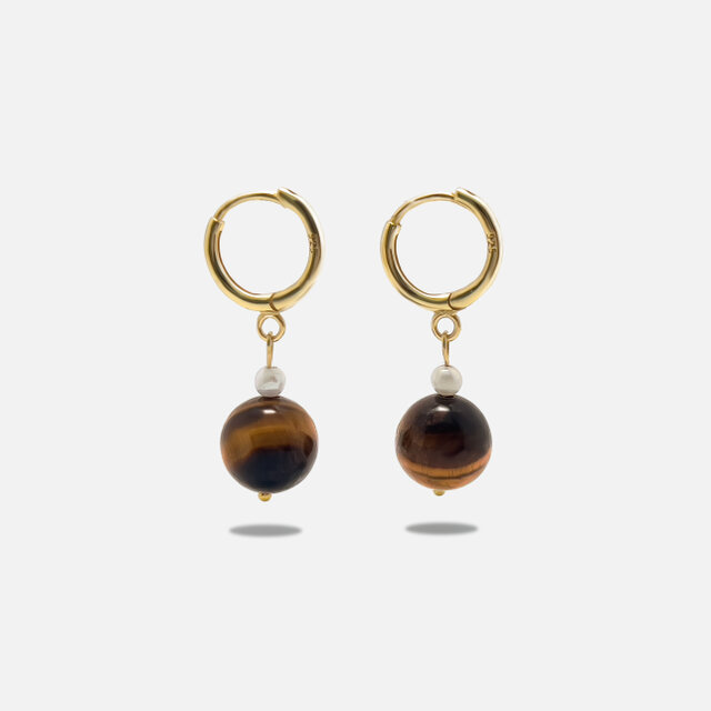 角度によって表情が変わる輝きが魅力の タイガーアイ に、やわらかな艶をもつ淡水パール を組み合わせた、ドロップタイプのフープピアスです。