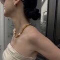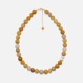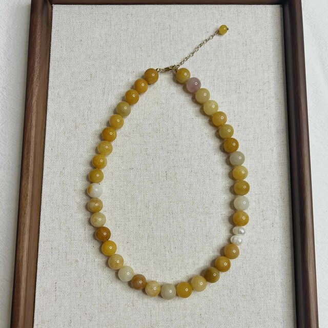 やわらかなイエローが印象的な 10mmの高品質イエローアベンチュリン に、淡水パールの艶を添えた、クリーンでモダンなネックレスです。