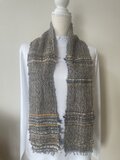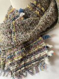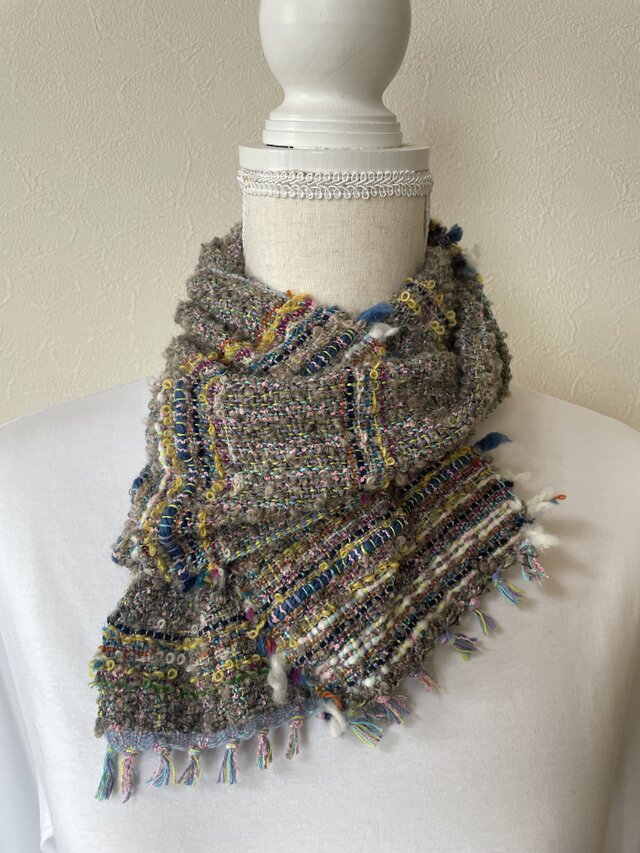 もこもこのグレー地に、カラフルな縦糸と横糸がチラホラしているミニマフラーです。