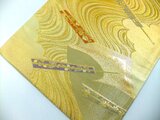 ■金糸地に流水とお扇子文様です。帯としての使用は殆どなかったようですが保管によるものなのか元々なのか、金糸部分の織りによるプツプツがあります。目立つダメージではございませんがお安くしました。文様は落ち着いた上品な色合いで高級感があります。