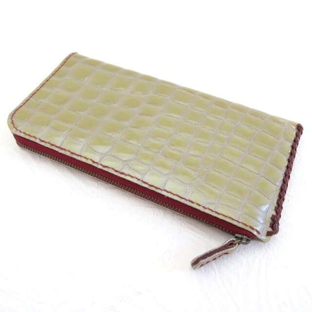 ☆パールベージュの肉厚な型押しクロコにワインカラーのパーツでアクセントを付けました。