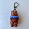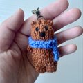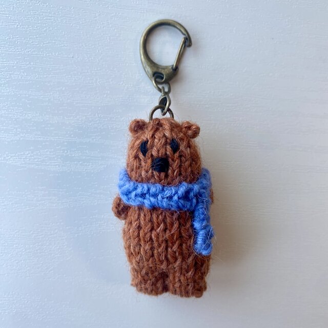 体は明るい茶色の毛糸、マフラーは水色の毛糸を使用しています。