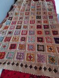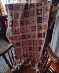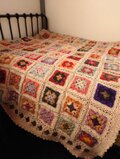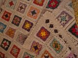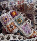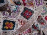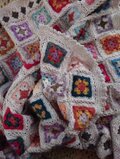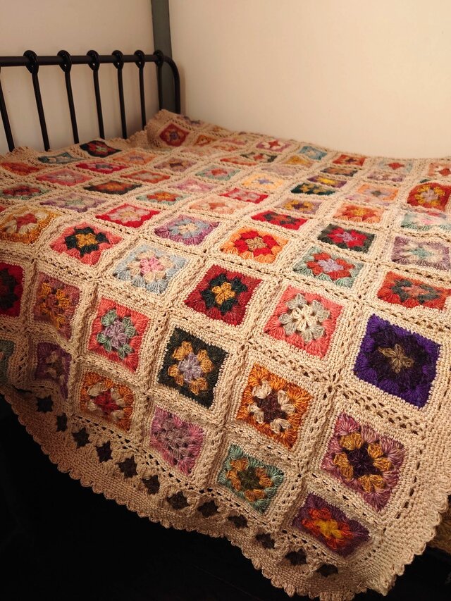 昔ながらのモチーフ編み「グラニースクエア」を様々な色の糸で編みつなぎ、一枚に仕上げました。