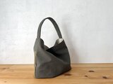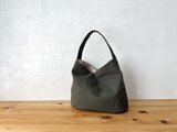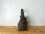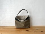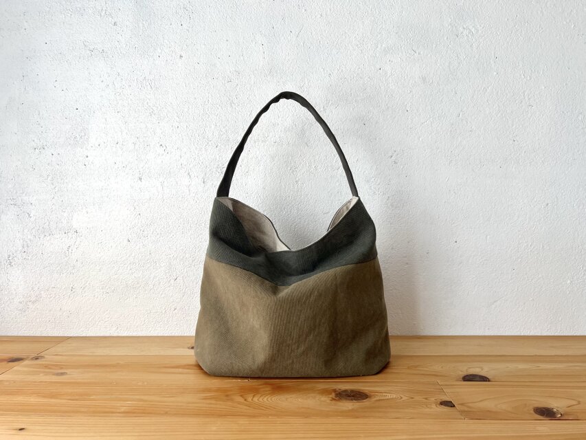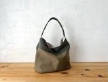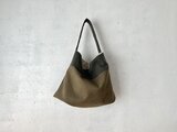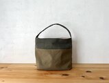 カーキ色、オリーブカーキ色の組み合わせで作りました。アンティーク加工された帆布生地です。しっとり、くたっとした手触りの良い生地になります。柔らかな鞄ですが、マチが14cmありますので、物を入れると自立します。