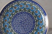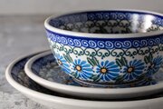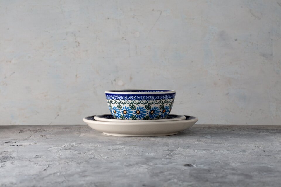 This Ceramika Artystyczna No.835 series set, handcrafted in Boles-awiec, Poland during the 1980s, is a radiant example of traditional Polish pottery. Adorned with hand-painted blue daisy motifs framed by swirling folk-inspired patterns, the set includes a salad bowl and two matching plates.