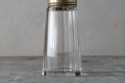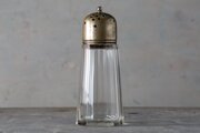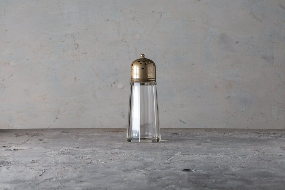 This sugar shaker from the 1960s pairs a faceted clear glass body with a silver-plated brass top, stamped “E.P.N.S.” (Electro Plated Nickel Silver). Its mid-century design offers both function and elegance, making it suitable for tea tables, kitchen use, or as a collectible accent. Signs of age include small chips, scratches, and patina, yet the piece remains in good overall condition. A refined vintage accessory that enriches daily rituals with nostalgic charm.