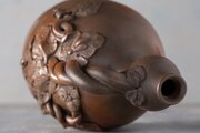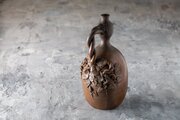 この古備前・古伊部様式の徳利は、岡山の南窯組・木村与介による嘉永年間の作。瓢箪形の胴に蔓と葉の精緻な浮彫がめぐり、無釉の備前土がもつ力強さと手仕事の妙が伝わります。赤褐色の肌に窯変や焼成痕が重なり、侘び寂びの趣をたたえた一品。床の間飾りや酒器コレクションにも映えます。