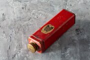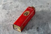 パウダー缶です。鮮やかな赤いボディに、天使のモチーフをあしらった金色の装飾ラベル、穴あきの振り出し口付きスクリューキャップが特徴で、華やかさと実用性を兼ね備えています。ブリキ製で、経年による傷や汚れは見られるものの、構造的には問題なく、色合いも鮮明に残っています。ジャズエイジの魅力を伝える化粧品パッケージとして、ヴィンテージ広告や初期化粧品史、ディスプレイ用コレクションにも最適な一品です。