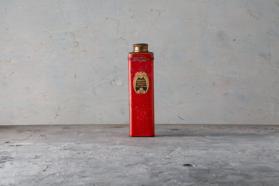 Description-This Mavis Talcum Powder tin by Vivaudou of Paris and New York is a striking example of early 20th-century packaging design. Produced in the 1920s, it features a bold red body, a gold decorative label with an angel motif, and a screw-top lid with shaker holes, reflecting both elegance and practicality. Made of tinplate, it retains its vivid color despite visible scratches, stains, and signs of age, and remains structurally sound. This piece not only embodies the glamour of the Jazz Age but also serves as a charming collectible for vintage advertising, early cosmetic history, or decorative display.