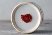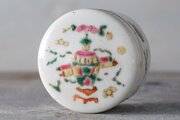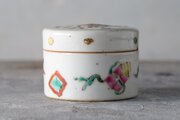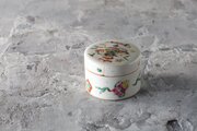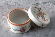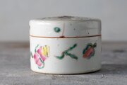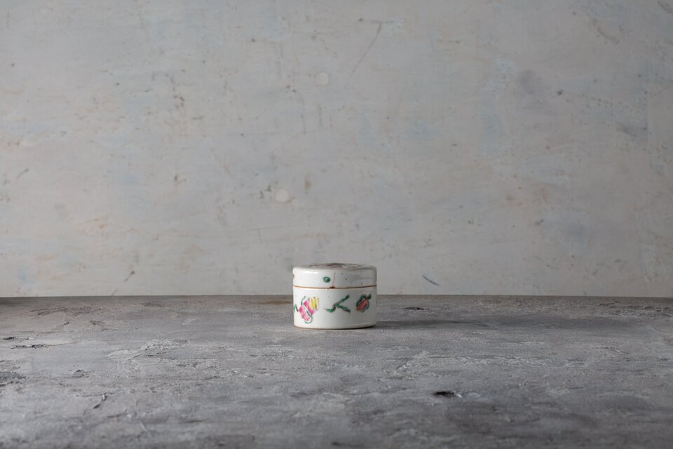 1960年代の中国粉彩朱肉入です。丸い小箱に伝統的な色絵付けが施され、底には中国文物局の蝋印が一部残っています。経年による小傷や欠けはありますが、コレクターや愛好家におすすめできる趣深い逸品です。書斎やインテリアのアクセントにもどうぞ。
