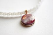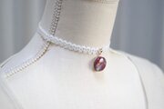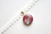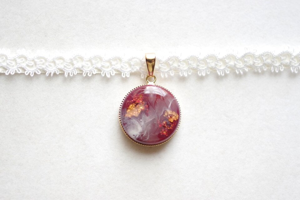 牡丹色に金箔をあしらい、ホワイトを燻らせた幽玄な雰囲気のレジンを、サテンリボンにタティングレースで装飾を施したチョーカーに仕上げました。