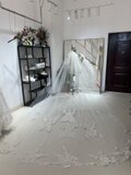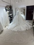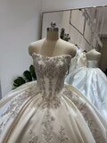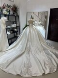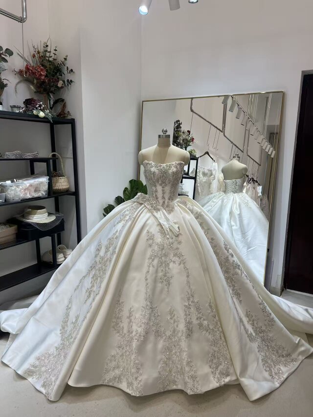 豪華!ウエディングドレス ベアトップ 韓国風ドレス フレアスカート ビジュー ミカドサテン ロングベール