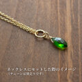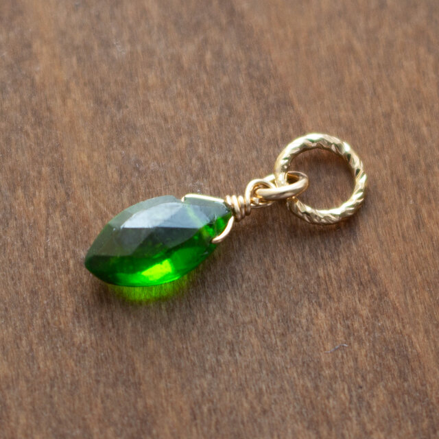 深緑に滴る雫をそのまま閉じ込めたようなクロムダイオプサイドをチャームにしました。