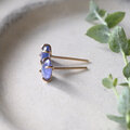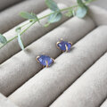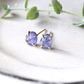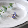 タンザニア産フリーフォーム片面ローズカットのタンザナイトのスタッドピアスです。夕暮れ時の空のような赤みのあるブルーがとても綺麗な石で、三角形が連なるローズカット面は丸みがあり光を反射して美しく輝きます。蕾型の繊細で可憐な立て爪が目を引くデザイン。金具は14kgfを使ったオリジナル。ゴールドフィルドワイヤーをカドミウム・ニッケル不使用の14金ロウでロウ付けし、一点一点手作業で石の形状を見ながら包んでいます。