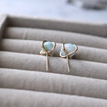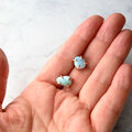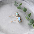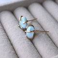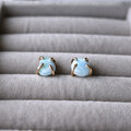 ドミニカ産ラリマーのスタッドピアスです。 カリブ海が世界に誇る希少な天然石でミルキーなブルーカラーに美しい波模様が見られます。表面は丸みのあるラウンドカットで艶がありとても可愛らしいです。こちらは極太の爪(14kgf)で包んだ存在感のあるペア。蕾型の立て爪が目を引きます。金具は14kgfを使ったオリジナル。ゴールドフィルドワイヤーをカドミウム・ニッケル不使用の14金ロウでロウ付けし、一点一点手作業で石の形状を見ながら包んでいます。
