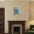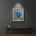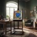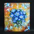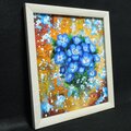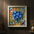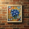 本作品の特筆すべきポイントは、中央に描かれた青い花々の美しさです。背景の抽象的な表現とは対照的に、花々は非常に写実的に描かれ、強い生命力を放っています。深い青色の花びらと白い中心部、さらにほんの少し見える緑の葉が、観る人に安らぎと希望を与えることでしょう。