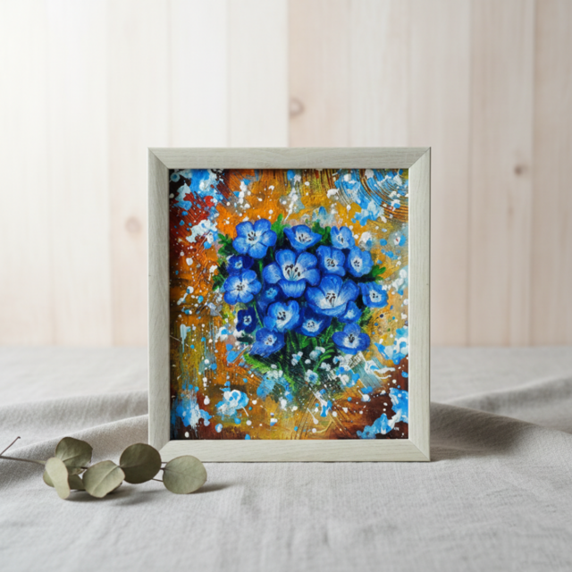 使用されている素材には、ホルベインの高品質な油絵の具と色紙が使われ、その鮮やかな色合いがネモフィラの美しさを一層引き立てています。この作品は、特別な瞬間を大切にするための美しいアートとして、ぜひお勧めしたい商品です。