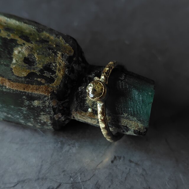 強い輝きを持つイエローカラーが美しい天然ジルコンを真鍮リングに仕立てました。