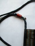 中綿を入れ、男絣で作ったループを付け、ループの先にトンボ玉と山サンゴを付けています。
