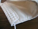 1度水通しして、ミシンをかけています。ワッフル生地生成りは、ホワイトよりふんわりした手触りです。手洗いをしていただき、形を整えて干して頂けると、アイロンなしでも大丈夫そうです。(裏側の2重ガーゼはしわができます)