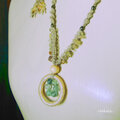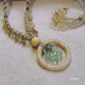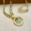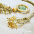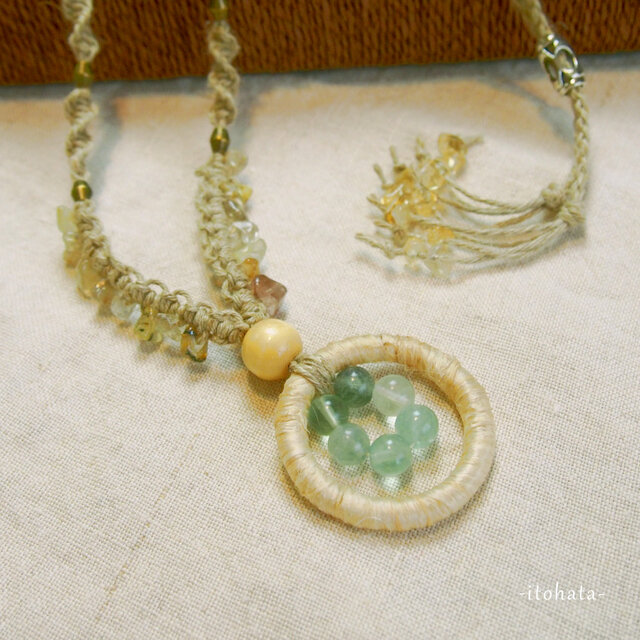 精麻のリングのなかには6つのグリーンフローライトの輪を吊り下げ、胸元にルチルクォーツを編み込みました。