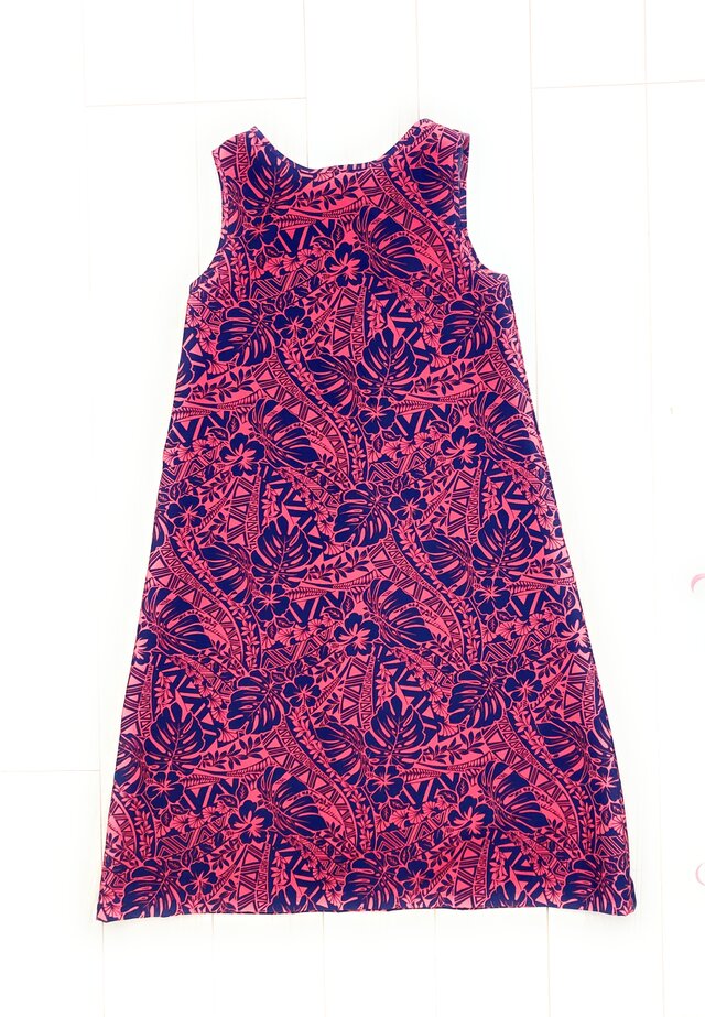 *デザイン:ハワイアン柄のファブリックでデザインした、とても着やすいノースリーブ・ワンピースです。後ろ姿もお洒落な、スリッドと可愛いリボン結びができるデザインです。使用した生地は、カヒコ柄(ハワイの伝統的な柄)をモチーフとした、ハワイアンタッチのデザイン柄でとても綺麗なプリント生地です。縫製は日本(made in Japan)で、一品づつ丁寧にハンドメイドしております。