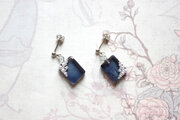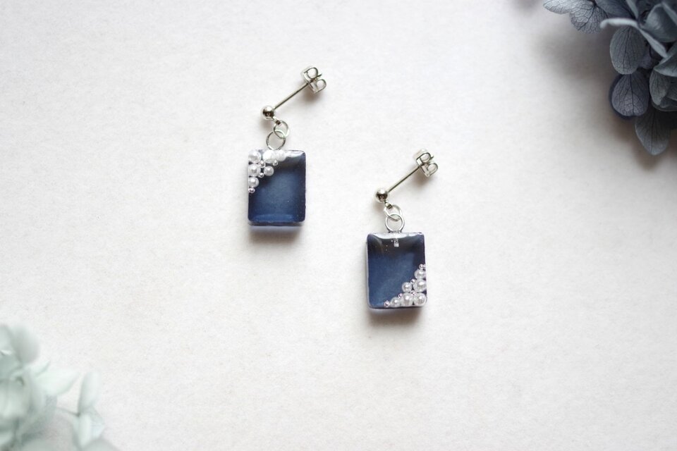深い紺色のレジンにパールとブリオンをあしらった、シンプルながらも可憐なピアス。
