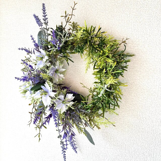 とても可憐で爽やかなリースで、一目で気に入りました。 初夏に涼しげなインテリアとして使う予定です。