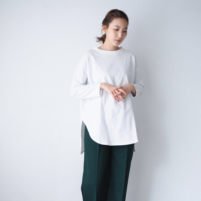 ジャケットやスウェット、パーカーなどのアウターとレイヤードしてもバランスが取りやすく、着回しが楽な万能Tシャツです。