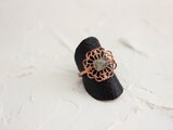 ヴィンテージフランスのレーシーな素材と原石アクアマリンを使い、エレクトロフォーミングで銅製のアンティーク感あふれるリングを作成しました。銅のオレンジカラーが個性的ですが、アクアマリンの色が穏やかなので柔らかいリングに仕上がりました。