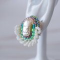 小さな作品を作るとき、まずメインのパーツを選びます。 そのパーツがいちばん美しく見えるように、隙間なく刺繍を重ねていくと── 色とりどりのビーズたちが、まるでおしゃべりしているような、にぎやかな仕上がりになります。