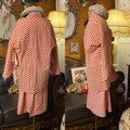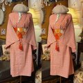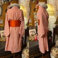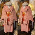 柔らかなオレンジ系のアンサンブル着物を、一着の美しいワンピースに仕立てました。アンサンブルならではの生地の統一感を活かしつつ、女性らしい曲線美を引き立てるシルエットに。総柄の細やかな意匠がどこかエキゾチックで、華やかな雰囲気を醸し出します。
