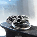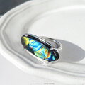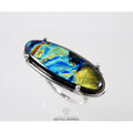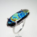 鮮やかな発色をもつスペクトロライトを、唐草と透かし模様の台座にセットしたリング。