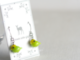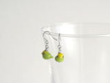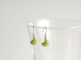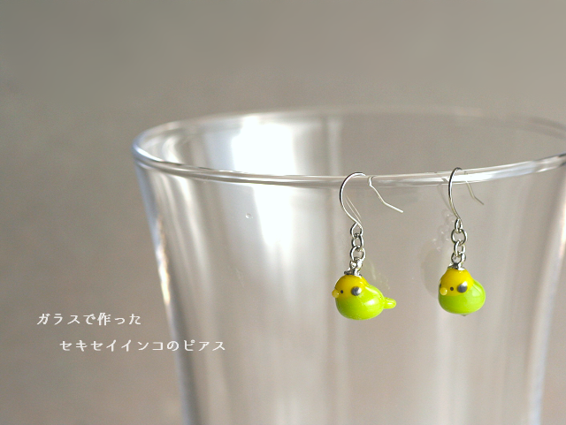 黄緑と黄色のカラフルな色合いが目を引く「セキセイインコ」をガラスで作りピアスにしてみました。