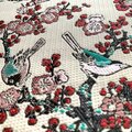 日本美術史に名を刻む狩野元信の「梅と鶯谷」花鳥図を、桐生織物が精巧な織技で再現した御朱印帳です。梅の可憐な花は生命力と吉祥を象徴し、舞う鶯は春の訪れと優雅さを表現しています。赤・緑・オフホワイトを基調に、繊細な筆致や構図の立体感を織物ならではの技術で具現化し、まるで絵画が立ち上がるかのような華やかさです。