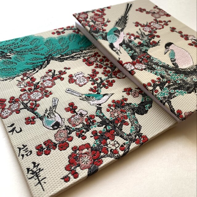 『梅と鶯〜元信筆』 狩野元信御朱印帳 美術名画御朱印帳 B6 大判サイズ 額絵織物 梅 鶯 鳥 花鳥図 日本画 桐生織物