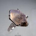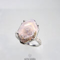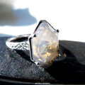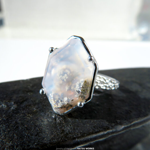 植物を閉じ込めたような独特な風景をもつモスアゲートを、唐草と透かし模様の台座にセットしたリング。