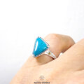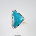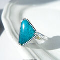 鮮やかなブルーのクリソコラカルセドニー / ジェムシリカを、18金のボールで飾った透かし模様の台座にセットしたリング。