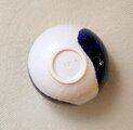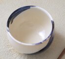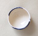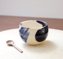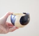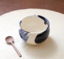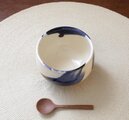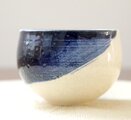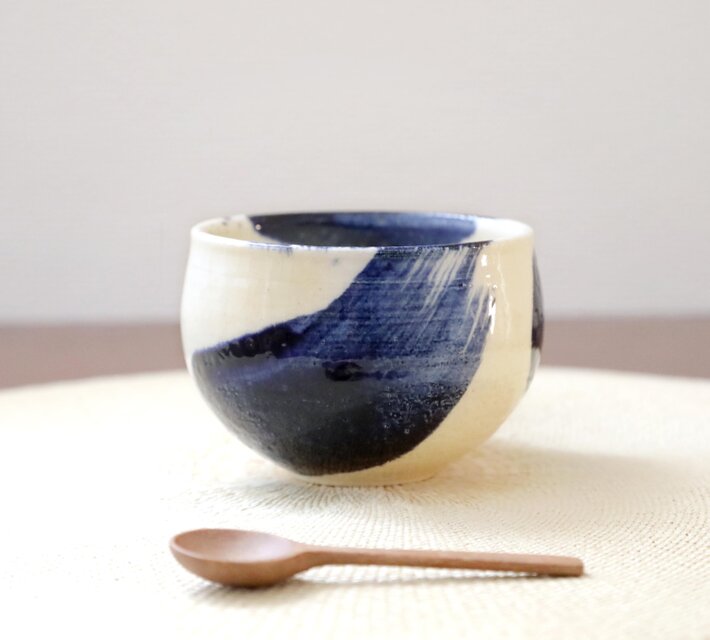 ころんと丸いお湯のみの形に成形後、呉須と呼ばれる濃紺の顔料で刷毛目模様を施し、艶やかな透明釉をかけて焼き上げました。