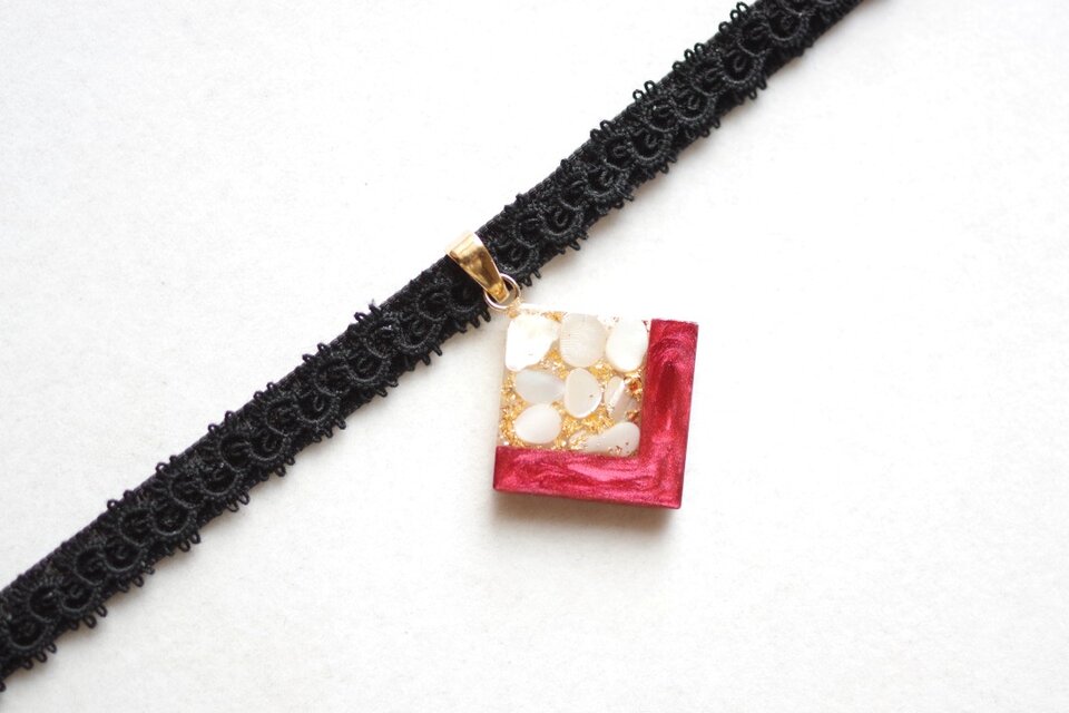 ホワイトシェルのさざれを沈め、光沢のあるルビーレッドで囲ったレジンを、ベルベットリボンにタティングレースで装飾を施したチョーカーに仕上げました。